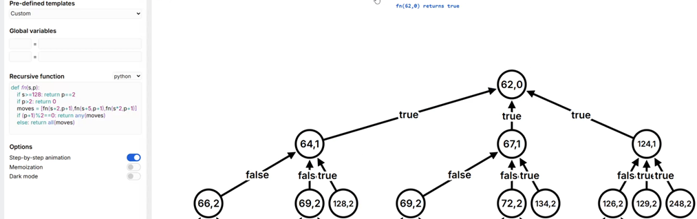 Можно получить визуализацию работы этой функции с помощью приложения https://recursion.vercel.app/. Например, для S = 62, дерево будет выглядеть так: