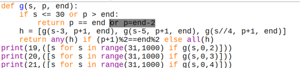 h = [g(s-3, m-1), g(s-5, m-1), g(s//4, m-1]