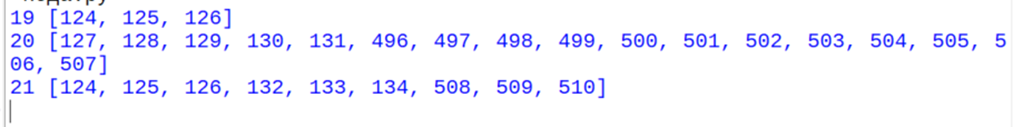 Для того, чтобы ответить на третий вопрос задачи (в этом случае игра должна закончиться пятым ходом (Петин третий ход)), нужно найти так же значения S, при которых Петя выигрывает за один или три хода. Для этого последовательно запустим программу для решения 21 задания, оставив сначала только условие p = 1, а затем оставив только условие p = 3. Получим два списка значений, Петя выигрывает первым ходом при S от 53 до 156, запишем их в отсортированный список p1, и Петя выигрывает своим вторым ходом при S = 17, 44, 45, 48, 49, 50, запишем эти значения в список p2.