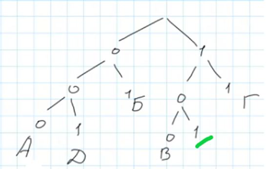 Незакодированными остались две буквы, Г и Д, и на дереве есть две свободные ветви – 1-1-0 и 0-1-0-0. 110 – это код длиной 3, а 0100 – код длиной 4. Для буквы Г выбираем кратчайший код, 110, это число – ответ на задачу.