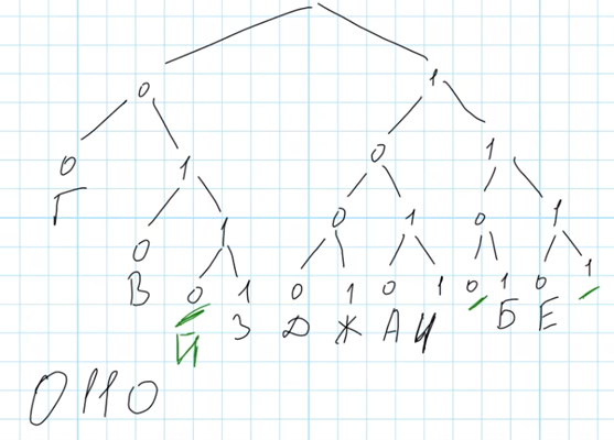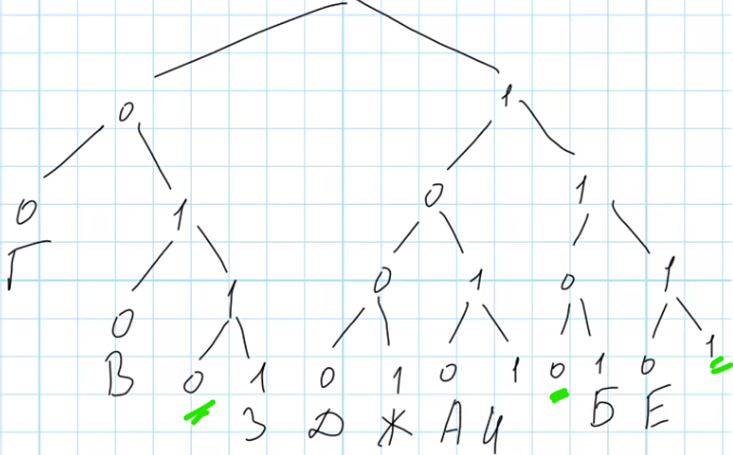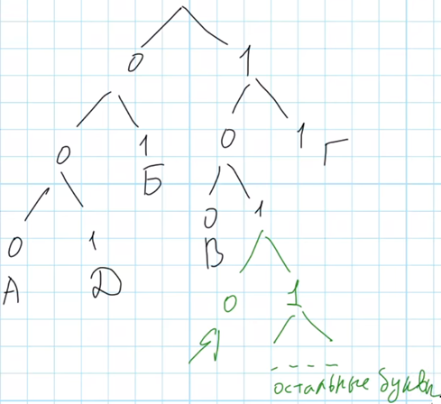 Следовательно, нужно создать новые ветви от корня 101: 1-0-1-0 и 1-0-1-1. На одну из ветвей запишем букву Я, а вторую можно разделять для кодирования оставшихся букв, нас не интересует как именно они будут закодированы.