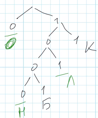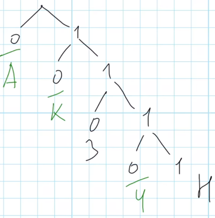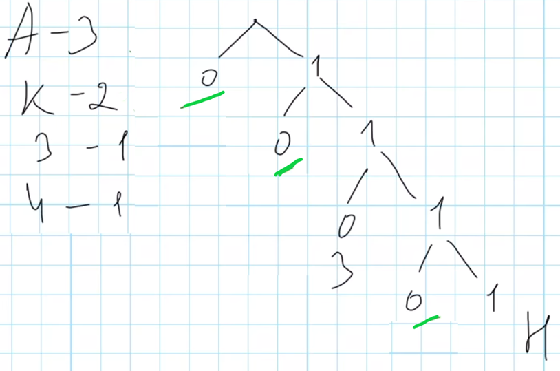 Нам нужно закодировать 3 буквы – А, К и Ч. Очевидно, что, раз буква А встречается в слове трижды, её нужно закодировать кодом минимальной длины, то есть кодом 0. Буква К встречается два раза, её код будет следующим по длине, то есть 10. Буква З уже закодирована, и для буквы Ч остается код 1110.