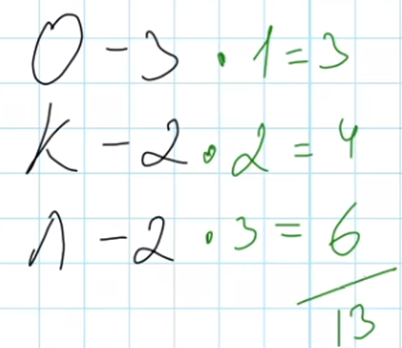 Необходимо подобрать такие коды для букв Л, Н и О, чтобы кодовое слово весило как можно меньше. Для начала составим схему, используя известные кодовые слова Б – 1001, К – 11 и посчитаем количество букв в слове КОЛОКОЛ, которое требуется закодировать: