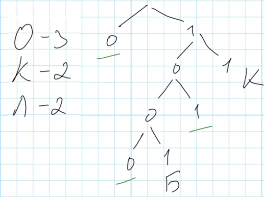 Нам нужно закодировать 3 буквы – О, Л и Н. Очевидно, что, раз буква О встречается в слове трижды, её нужно закодировать кодом минимальной длины, то есть кодом 0. Буква Н не встречается вовсе, поэтому она может быть закодирована длинным кодом, то есть кодом 1000. И буква Л встречается два раза, её код будет 101.