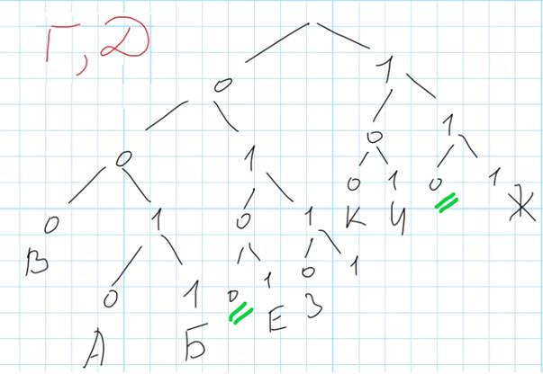 Буква Е получила код 100, длиной 3, буква Ж – код 101, длиной 3, и буква З – код 11, длиной 2.