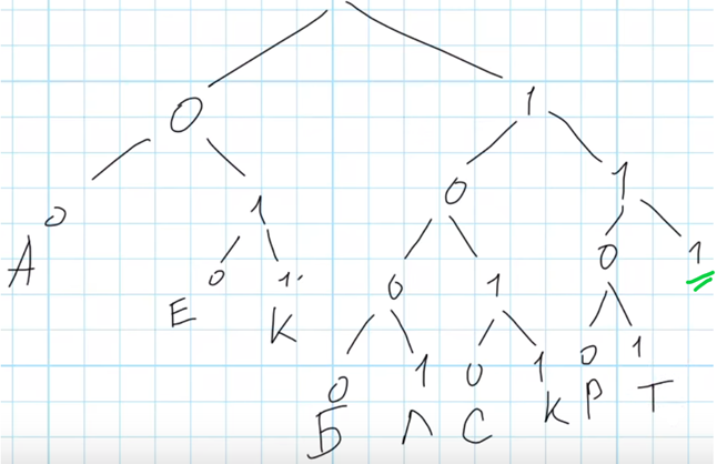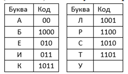 (ЕГЭ-2024) По каналу связи передаются сообщения, содержащие только десять букв: А, Б, Е, И, К, Л, Р, С, Т, У. Для передачи используется неравномерный двоичный код, удовлетворяющий условию Фано. Для девяти букв кодовые слова известны: