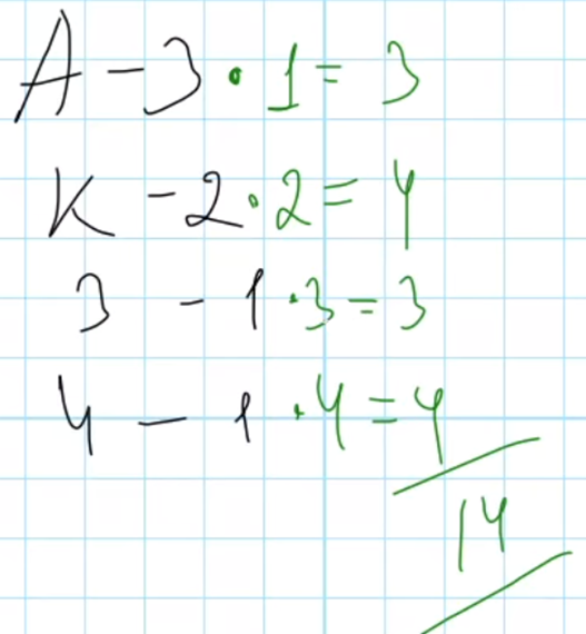 (ЕГЭ-2022) По каналу связи передаются сообщения, содержащие только буквы из набора: А, З, К, Н, Ч. Для передачи используется двоичный код, удовлетворяющий условию Фано. Кодовые слова для некоторых букв известны: Н – 1111, З – 110. Для трёх оставшихся букв А, К и Ч кодовые слова неизвестны. Какое количество двоичных знаков потребуется для кодирования слова КАЗАЧКА, если известно, что оно закодировано минимально возможным количеством двоичных знаков?